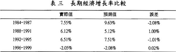 下面看模型對較長期經濟增長的事後預測能力。我們在表三中計算了每四年之平均經濟增長率及模型的相應靜態預測值。由此可見,其預測結果與實際數字相當貼近;最大誤差之絕對值只為2.08%,最小為0.02%。