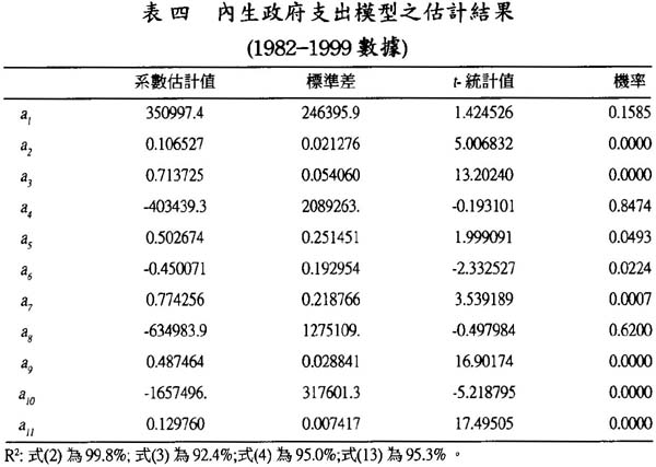 式(13)即謂政府當期支出取決於去年經濟狀況。以最小平方法估計模型結果見表4。