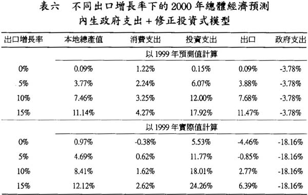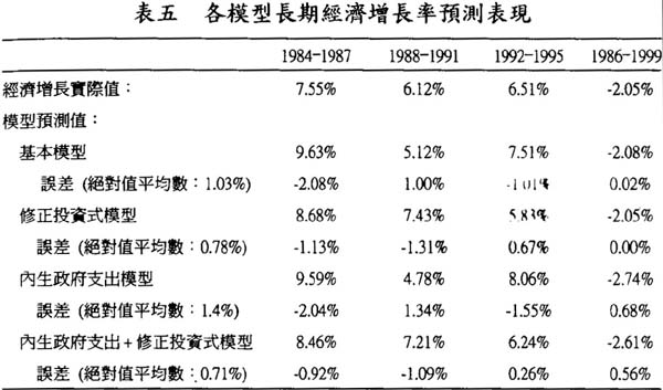 表五比較了兩類模型對經濟增長預測之事後預測值。內生化政府支出後預測力稍降;以修正基本模型為例,誤差之絕對值平均數由1.03%上升至1.4%。