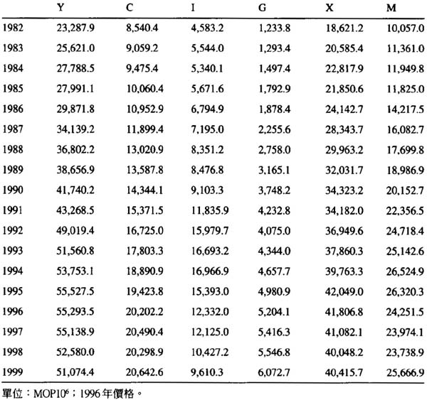 本文採用數據基本上來自澳門特別行政區政府統計暨普查局出版之《本地生產總值》(2000年6月版)。由於該版本只提供1993年到1999年固定價格數據,我們利用1982年到1999年當年價格數據及平減系數推算固定價格數列。方法如下: