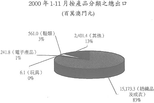 按產品分類之出口,以紡織品及成衣為主,其餘為玩具、電子產品和鞋類。由於本澳電子和玩具業競爭力較弱的關係,廠商相繼結束營業,其重要性正不斷下降,由1995年佔總出口比重的6.1%下降至2000年的1.3%,紡織品及成衣以4.3%之年平均增長率的速度上升,其佔總出口的比重,由1995年的76.6%上升到2000年的82.5%。