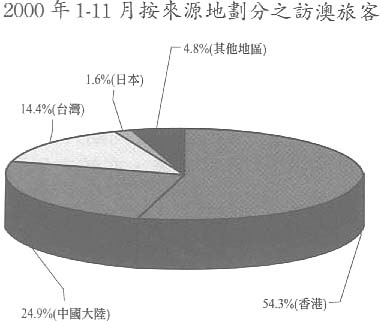 2000年1至11月入境旅客達835萬,較去年上升22.8%,估計全年可達900萬人次,將為歷史的新高,中國內地成為繼香港後第二大旅客來源地,而台灣旅客亦有可觀增長,三地區分別較去年同期增加16.8%、37.5%及33.3%,比重分別為佔54.1%、24.8%及14.4%,至於日本旅客只佔1.6%,遊客增加的主要原因是香港經濟好轉,內地政府繼續增加訪澳簽證名額,加上本澳新開往中國各省市及增加往台灣航線,吸引台胞使用澳門國際機場,而本地治安亦明顯改善,有助消除旅客的擔憂。