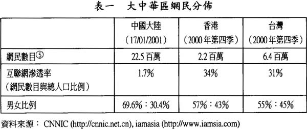另外,根據最新數據,有關在大中華區(包括中國大陸、香港、台灣)的互聯網滲透情況,如下表顯示,中國大陸網民有2250萬,香港有220萬,台灣有640萬,滲透率分別是1.7%、34 %及31%。男女網民的比例三地都是以男性為多,但以台灣的男女比例為最接近,香港次之,大陸差別最大。