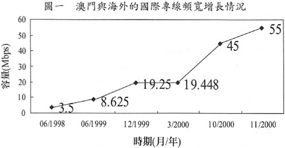 在彈丸之地的澳門,於1994年開始連接上國際互聯網,1995年開放予公眾使用,現時互聯網的使用已經進入政府、商業、教育、家庭等各個應用層面。根據最新官方數字,截至2000年9月,全澳互聯網註冊用戶總數達24,373戶,比1999年同期上升超過58%,呈指數增長。網民數量方面,15至64歲的網民數量估計超過13萬人,佔總人口約30%,互聯網滲透率與香港相若,比同在大中華區的北京、上海、廣州及台灣的比率還要高。