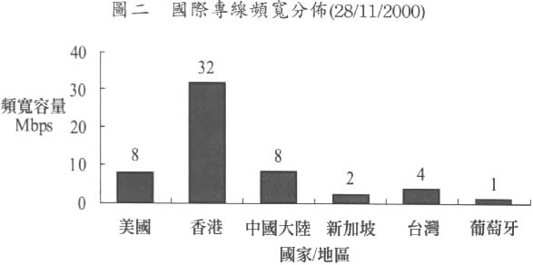 另外,頻寬容量的大小,直接影響到互聯網訊息的交換與流通。本澳連結至海外的互聯網總頻寬容量,於1998年6月為3.5Mbps,於2000年11月增加至55Mbps,前後30個月的升幅近16倍,自寬頻服務推出後的升幅尤大(見圖一)。而通向海外的國際專線分別有香港、美國、中國、新加坡、台灣及葡萄牙等,其中至香港的頻寬最大,達32Mbps(見圖二)。