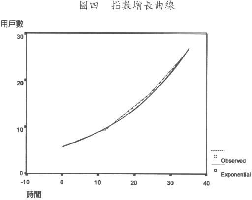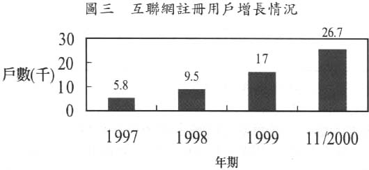 在互聯網用戶方面,自1997年開始,本澳互聯網註冊用戶數量持續高增長,由1997年的5800戶,增加至2000年11月的2.67萬戶,增幅非常吻合指數增長曲線(見圖四)⑨。預計在2001年底,註冊用戶將達4.7萬多戶。⑩必須注意的是,現時註冊用戶人數只佔本澳總人口的6%,此數字未能真實反映本澳的網民數目。