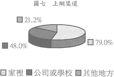 網民的上網地點包括在家裡、公司或學校,以及其他地方,例如他人家中、網絡咖啡室和公共圖書館等,在377個回應者當中,於家中上網的人次最多,有298人次,佔79%,其次在公司或學校,有181人次,佔48%,在其他地方的亦有129人次,佔21.2%。