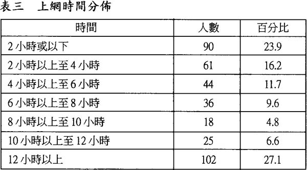 統計結果顯示,網民每星期平均上網時數為10.4小時,然而分佈差異很大,其中上網12小時以上的網民最多,佔27.1%,其次為2小時或以下的佔23.9%。每天平均在家上網1.7小時,在公司或學校為1.3小時,其他地方為1.1小時。