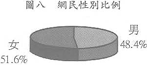 在上網的386人當中,女性佔51.6%,男性佔48.4%,與總體人口比例結構相若,顯示女性網民與男性網民的比例接近,這結果與香港、台灣及中國大陸的結果有點不同,該些地區的女性網民增長的速度雖然很快,但仍以男性居多。不過,按照全球的增長情況來看,男女網民的比例最終會非常接近(見圖八)。