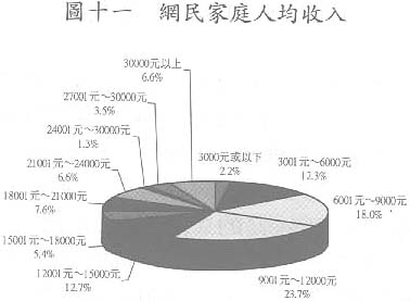 在網民當中,以中等收入的家庭居多,由6000至15,000元澳門幣收入的家庭佔整體的54.4%,低收入家庭如6000元澳門幣以下的只佔14.5%。從相關分析得知,家庭收入與上網與否有顯著關係(Pearson'sR=0.352,p<.01,2-tailed)。