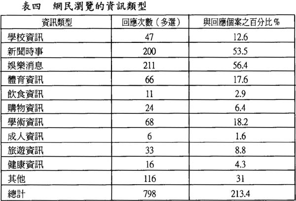 網民通常瀏覽的資訊類型以娛樂消息和新聞時事為主,分別佔56.4%及53.5%,以互聯網作為學術和學校資訊的來源也佔了相當的比例,兩者合共佔30.8%。