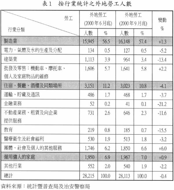 在外地勞工方面,截至2000年9月底,在本地區的“外地勞工”共有28,113人,較上季及1999年同期分別下跌0.4%及13.8%。外地勞工當中,80.8%來自中國內地,當中女性佔了73%。根據治安警察局截至2000年11月底的資料,所錄得“外地勞工”為27,606人,比本季度減少1.8%。過半數的外地勞工(57.4%)從事“製造業”,次之為“住宿、餐廳、酒樓及同類場所”(10.8%),及“僱用傭人的家庭”(7%)等行業。