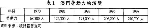 勞動力,或者說,在經濟上十分活躍的人,是由那些從事有酬職業,或者那些積極尋求就業機會的人組成。到1998年為止,澳門的勞動力大約增加到210,000人。然而,澳門勞動力的增長一直不順利和不平穩。表1列出各個年份勞動力的規模。細看該表會發現基於克里默(1991年)提出的看法——澳門經濟增長的3個明顯的時期。