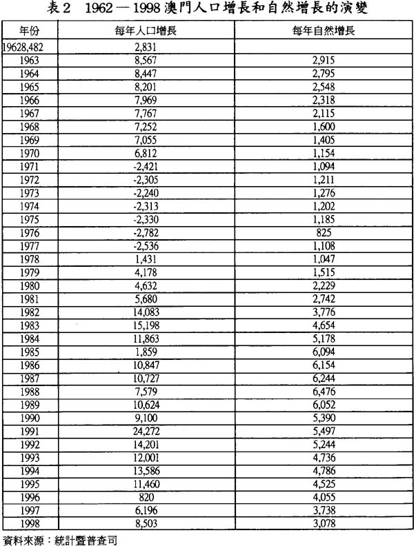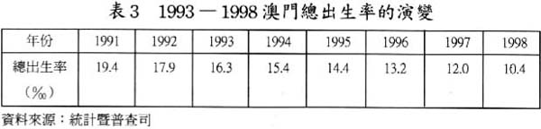 雖然總人口的增長一直是反複無常,表3表明,在人口自然增長之前一直有一種穩步下降的趨勢。鑒於澳門總出生率的下降,從長遠來說,很難保持人口的增長。收入的增長和撫養孩子開支的增長——從婦女所花的時間成本和居住面積的開支的角度來看,都是如此,促使人口出生率的無疑下降。