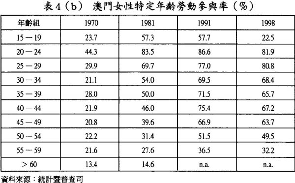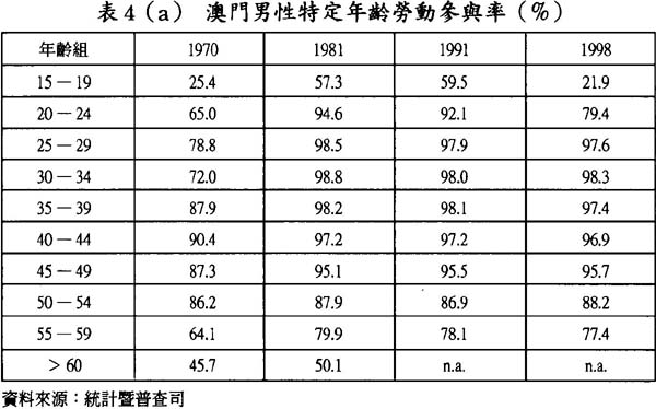 表4(a)列出了在1970,1981,1991和1998特定年齡男性勞動力的參與率。年齡在25-49之間的勞動力的參與已接近100%,在這幾年裡幾乎沒有任何變化,而工資的水平又大大有所改善。至於年齡在14至24的這一群體中,勞動力的參與率在1970-1981期間有所增長,但是在最近幾年有所下降。這主要是因為人們對教育和大大地改善教育機會的重視。表4(a)還表明,老年男性勞動力的參與略有下降。由於日益增加的收入,悠閑已變得更加寶貴,人們退休提前。