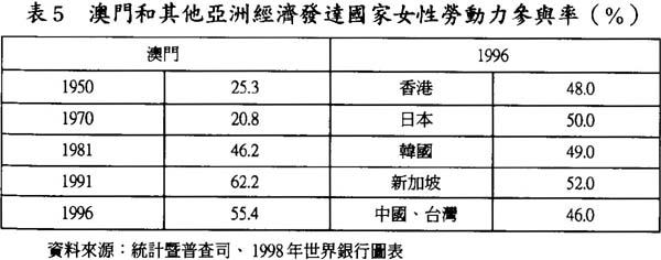 壯年男性勞動力的參與一直保持穩定,而表4(b)表明,壯年女性勞動補給在明顯增長。例如,年齡在25—29之間的女性勞動力的參與率從1970年的29.9%增至1998年的80.8%。解釋女性勞動力參與大量增加的原因可能有幾個。第一,澳門婦女結婚年齡推遲。女姓結婚的中間年齡從1991年的26.8歲增至1998 年的27.4歲。由於單身女性參與市場工作的可能性大於已婚女性,她們通常推遲婚期,以增加勞動的參與,這種受人歡迎的思想進一步增強了遲婚的行動。第二,澳門出生率一直在下降。減少照看孩子責任再次促成勞動的參與。可以肯定,遲婚和出生率的下降可能是這種結果產生的原因,也是女性勞動參與率上升的原因。在本文涉及時期,女性的教育和工作機會已得到明顯改善。社會的態度對職業女性也變得更為同情。然而,即便在1996 年,女性總的勞動參與率為55.4,這個比率高於如表5所示的亞洲四小龍(香港、韓國、新加坡和中國台灣)。澳門女性勞動力參與進一步增加的餘地不大。