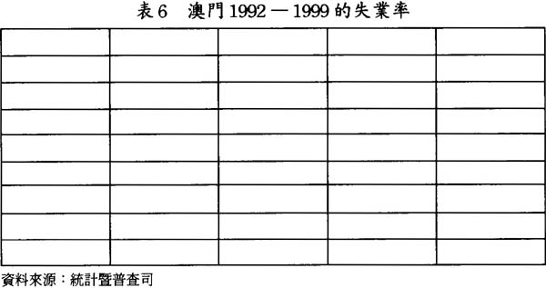 組成勞動大軍的人可以分成兩組:就業者和失業者在1992年以前,澳門政府還收集定期就業的統計數字。表6表明澳門失業率的變化。1996年,澳門經歷了很高的失業率。所幸的是,失業比率在年底很快下降,但是自從1998年中以後,再次上升。統計暨普查司記載1999年第三季度的失業率為6.9%。對澳門工人來說,這是一個困難年,在1992—1999期間,平均失業率為3.6%,在這8年的21個季度中,失業率低於4%。