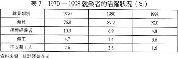 就業者的活動狀況的分配在表7中可以看到。儘管1980年的數據無法得到,表7表明,不支薪工人(通常在小型家庭行業工作),或個體經營者的比例隨着時間的推移在穩定下降。雖然中國有一句俗話說:“工字不出頭”,但是,激烈的競爭、日益變化的經營環境和極高的商業致命率以及澳門市場等因素,使受僱人當上僱主日益困難。隨着時間的流逝,這種情況是造成僱員的百分比同處於活躍狀況的其他群體相比日益增長的原因。