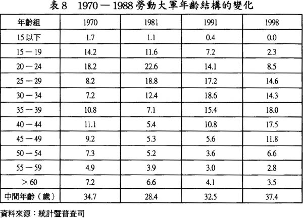 表8表明勞動大軍的年齡結構在變化。鑒於移民的平均年齡比本地人年輕,在70年代和80年代期間的大批移民潮促使了勞動大軍中的中間年齡迅速減少。
