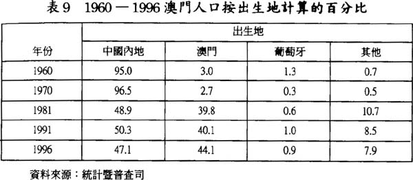 在表9,可以看到按照出生地澳門人口的組成,因為眼下尚未得到這部份勞動大軍的的組成情況。1996年只有44%的人口是本地出生的。幾年來在中國內地出生的人口的比例在下降,但是在1996年,仍保持在47%,在1980年初,對澳門的純移民增到100,000人,到1996年底,澳門已是一個擁有41.4萬人口的城市。雖然來自中國內地的人已約佔50%,但是,值得提及的是,來自其他國家的人的百分比增加了,從1960年的0.7%增加到1996年的7.9%。澳門吸引了來自菲律賓、泰國和其他國家的一部份勞動力。其部份勞動力由家庭女傭和保安組成,另一部份由熟練的、訓練有素的專業人員組成。