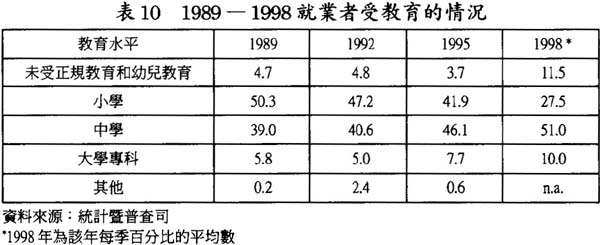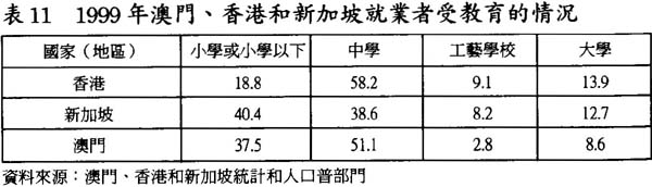 如表11所表明的,澳門勞動大軍受教育的水平遠遠落後於經濟發達國家和地區,特別是受過小學和小學以下教育的工人比例相對較高,而受過高等教育的工人比例相對較低。由於政府在澳門實行擴大大學教育的政策,還由於進入勞動市場的年輕人受到的正規教育多於老的退休人員,預料勞動大軍受教育的機會日益上升的趨勢將會繼續。