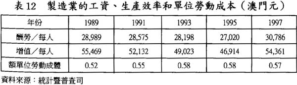 澳門在1989—1995期間,製造業的薪酬按每年1%的比列下降,而增值額以2.4%的更快的速度減少。因此,單位勞動成本(酬勞是增值額的一部份)實際上略微有所增加,從0.52增加到0.58。後來在試圖生產更高增值產品和更多資本密集產品時,日益變壞的狀況似乎有所緩解,單位勞動成本降至0.57。在1976-1994期間,香港勞動製造業收入每年以4.5%速度增加,而增值額以5.2%的更快的速度增加,從而導致單位勞動成本從0.56減至0.50。雖然香港的單位勞動成本包括諸如解顧費和退休金供款之類的費用,而澳門單位勞動則不包括這種費用,但是香港的單位勞動成本仍然低於澳門的0.58。