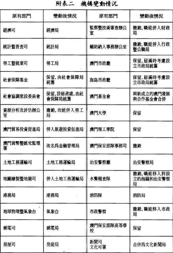 如果我們細心分析澳門行政組織架構圖(附表一),會發現臃腫情況尚非想像中那麼嚴重。嚴格來說,總督和七個政務司的辦公室並不能視爲司級部門,衹不過辦公室主任享有司長的待遇而已。實際上,他們的待遇比司長還高一些,而不少司級部門,如澳門貿易投資促進局、貨幣暨匯兌監理署、兩個市政廳、澳門基金會、澳門大學、澳門理工學院等每間自治機構都有多個相當於司長或更高級的官員。要改變這種情況,祇能從改革行政制度着手,或將某些機構半私營化,或將某些機構(如學術機構)脫離出政府架構。另一方面,消費者委員會、環境技術辦公室等又僅享受廳級待遇,而社會協調常設委員會和諮詢會秘書處則不應列入架構圖中,大多數辦公室還可以撤銷。粗略分析現行架構圖,我們認爲行政機關的“關、停、併、轉”仍有可爲,或將其撤銷,或將其合併,或將其降級,而絕大多數則要改中文名(附表二)。經整合,特區政府組織的輪廓已初露(附表三)。然而,這是一個粗線條的不很成熟的構想,改革時尚需認眞分析每個部門的具體職能,因此,我們想進一步作出如下幾點說明: