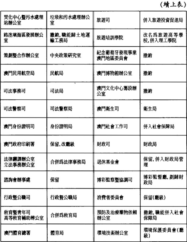 5.澳門市政廳和海島市政廳維持現狀,直至市政改革完成後,可再移入社會文化司。原有部分職能移入相關政府部門。