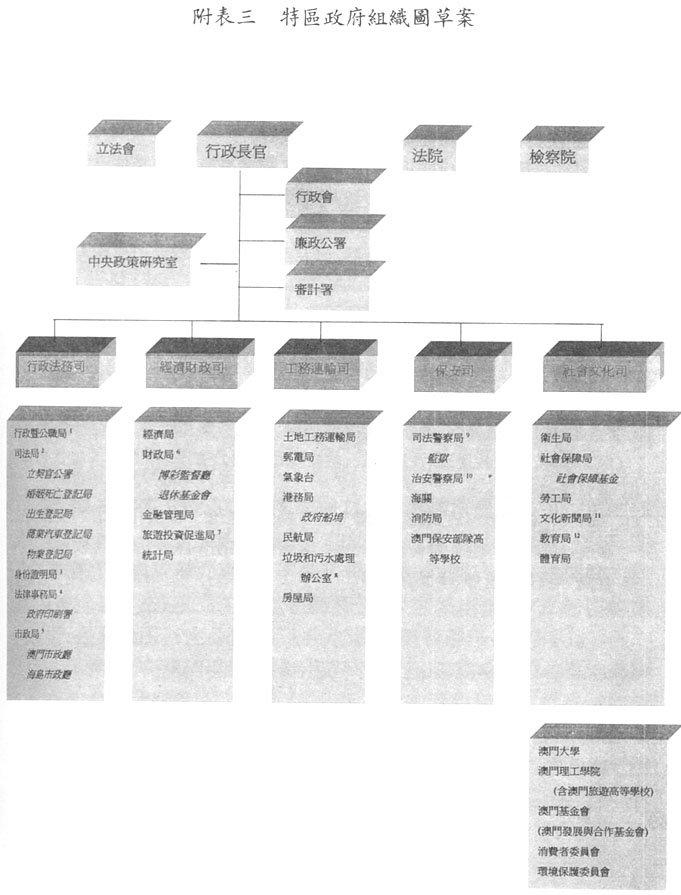 不過,既然特區籌委會已作出決定,特區政府大致會按這一決定來組織。爲了更好更淸楚解釋此一構想,似乎有必要將政府組織進一步細化。應該聲明的是,下述政府組織架構是一個力求最少變動的初步方案,僅供參考,旨在抛磚引玉。特區行政長官如何以及何時始分階段實施行政改革,當應考慮其時的政治、經濟和社會環境和條件。最近,我們還提出,全面系統的行政改革,應在特區成立後,由行政長官委任一個由政府官員和社會各界代表組成的工作小組,在廣泛聽取各界意見和認眞討論後循序漸進地展開⑥。