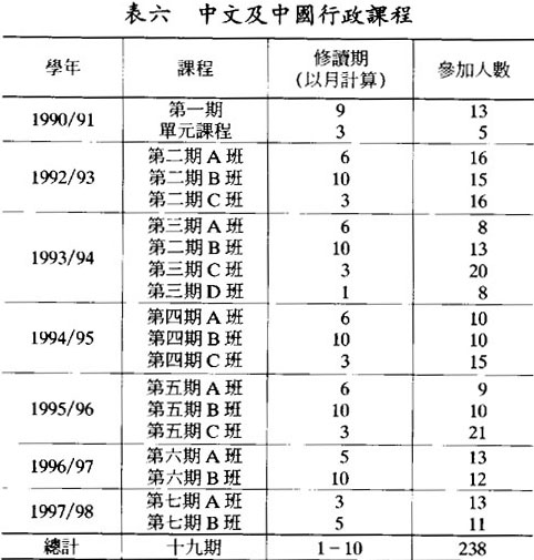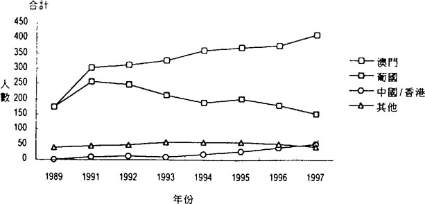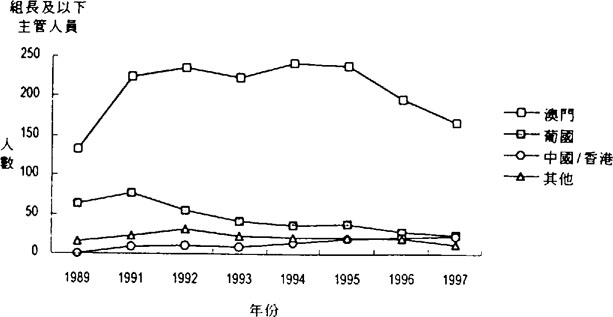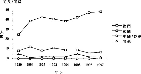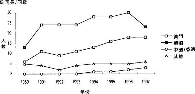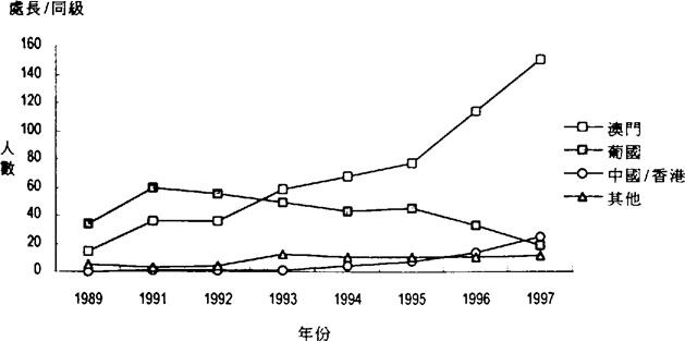 我們粗略對已晉升領導主管職位的華人公務員作過統計,發現絕大多數都是80年代中後期進入公職的。這與公務員隊伍1996年的平均工齡9.69年十分脗合。事實上,從公務員平均工齡亦可以看出,更多的本地華人靑年精英在80年代末進入公職。1987年的平均工齡爲8.39年,1989至1991年下降至不到7年,此後逐漸回升。換言之,隨着公務員的本地化,公務員隊伍也日趨穩定。到1999年回歸時,平均工齡可達10年以上。