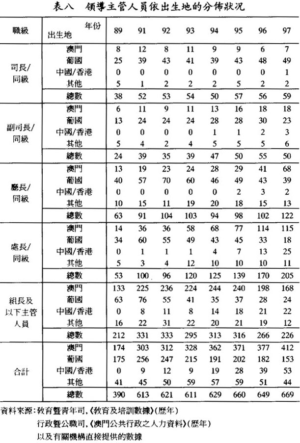 公務員方面,也存在許多隱憂要早日消除。如早些時候,有些經驗豐富的公務員,卻不願合作或侍才傲物,又或不欲留澳服務,自然不宜被視爲本地化對象,應將機會讓給那些經驗雖不足、但有潛質且對未來有信心的本地公務員。納入葡萄牙編制工作完成後,這方面的不明朗因素已基本消除。