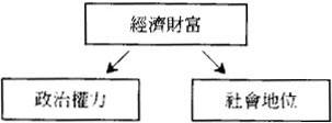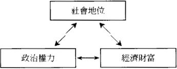 不同意馬克思之說的學者韋伯(Max Weber),則認爲應以社會階層此槪念去說明一個人在社會結構的位置更爲合適。韋伯強調社會階層可由三個獨立自主的層面:經濟財富,政治權力、及社會地位來構成,而三者更是互相依賴及影響,如下圖:②