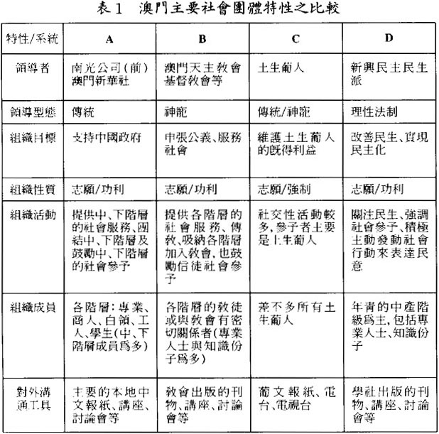 澳門社團的數目不少,而較爲積極參政的,可稱爲社會力量,(12)對這些社會力量有較詳盡的分析,可見吳國昌的說法。(13)吳國昌將澳門的社會力量分爲五個系統,稱之爲ABCEO系統,A系統是傳統、左派、愛國等力量,B系統是宗敎、敎會、西方宗敎等力量,C系統是土生、葡裔、Macauese等力量,D系統是新興、民生、民主等力量,O系統是指其他的社會政治力量。(14)從這些社會力量組織,可以反映它們所代表的社會階層;因此,從研究澳門的社會力量便能夠了解各個主要社會階層的參政情况。