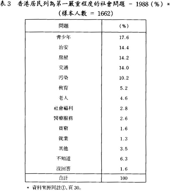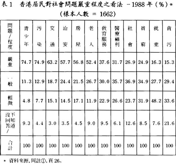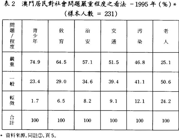 在選取的12個社會問題當中,香港居民在80年代末期時認爲靑少年、污染、交通、治安、房屋、及老人等問題嚴重,每個問題均有超過五成的居民指爲嚴重,分別是74.7%、74.9%、63.2%、57.7%、56.8%和52.4%(見表1),值得注意的是靑少年及污染問題均有大約七成半的居民認爲嚴重;這情況與澳門相似,澳門近日也有大約七成半的居民認爲靑少年問題嚴重,其他的社會問題,例如:敎育、治安、交通等問題亦有超過五成的居民指出是嚴重,認爲這四個社會問題嚴重的分別是74.9%、64.5%、57.1%和51.5%(見表2)。