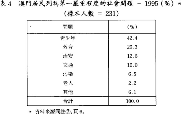 由是觀之,靑少年問題的嚴重情況不管是在香港或澳門,都被其居民指爲一個嚴重的社會問題現象;雖然有關香港的數據衹反映了80年代末期香港的情況,但當時香港的發展程度有類似今天澳門的情況;因此,高速經濟社會發展下之影響,都可於靑少年問題之嚴重程度中一一反映了。然而靑少年問題之嚴重,不僅在香港及澳門社會如是,它也普遍存在於其他華人社會當中,諸如中國大陸、新加坡、及台灣等,其情況也是日趨嚴重。事實上靑少年問題之泛濫,不單衹顯現在高速發展之華人社會當中,歐美日本等世界強國也不例外,這都反映了靑少年在社會結構改變當中的不適應,除了各社會要爭取經濟富強外,還應照顧個人,特別是年靑一代在高度社會經濟發展中之適應情況。