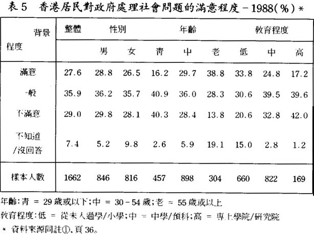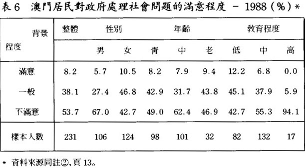 一般而言,敎育程度較高的人會對社會上所發生之事情特別關注,也較主動監察政府之行政及評價所施行之政策,他們又較淸楚地了解政府在社會中的角色與責任,倘若社會問題不斷出現,而且還越來越嚴重地存在着,他們都會抱批判的態度來評價政府處理社會問題之表現。由於香港及澳門的情況頗一致,這都反映了學校敎育同時在兩個社會中起了作用,敎育程度較高的居民都願意肩負起社會批判者的角色,對政府實行政策,起了一定程度上的監察。