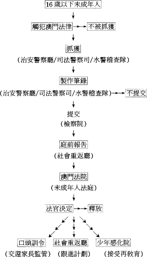 在澳門無論是任何人士(包括未成年人)做出了違犯法律的行爲,都會被警方抓獲,當疑犯送交警暑後,會視乎犯罪証據是否充足而決定起訴與否;在一般情況下若疑犯是未成年人,初次犯了較輕微的案件,又表示悔意,以及家長願意監管的情況下,都會被警方無條件釋放。但假若未成年人犯了較嚴重的罪行,便會提交澳門檢察院決定是否需要送交澳門法院處理;若被送交澳門法院未成年人法庭處理,未成年犯事人會在法庭接受詢問,一般情況下在接受詢問之前,社會重返廰的技術人員會對該未成年人的心理、家庭、學校、人際關係等方面作出評估,然後向法庭提交報告,作爲法官非刑事判決的參據。澳門未成年犯事人的司法處理流程如下:(見圖1)
