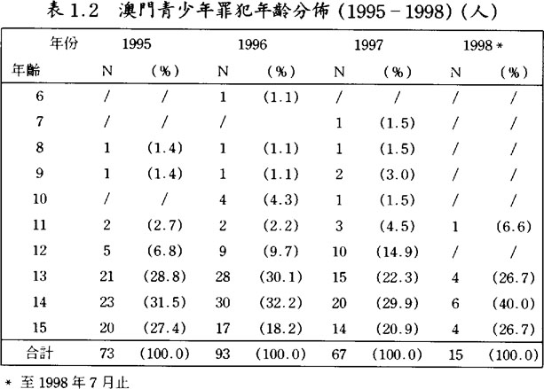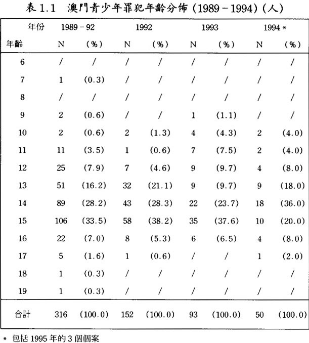 靑少年犯罪的年齡由1989至1993年的平均最多是15歲時犯罪降至1994至1998年平均最多是14歲時犯罪,而其次多犯罪時的年齡也從1994年的15嵗降至1995至1998年的13嵗,(見表1.1及1.2)以上發現足見靑少年犯罪的年齡明顯地有普遍下降之趨勢。