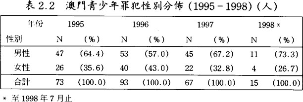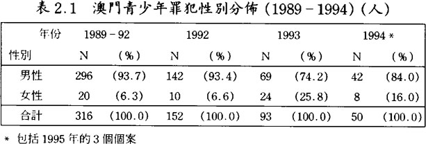 1989至1992年時期,女性靑少年犯罪只佔全部靑少年犯罪的個位百份比;但到了1993年開始,除1994年之外,則佔全部靑少年犯罪之四份之一以上,1996年更超過四成。(見表2.1及2.2)由此可見女性靑少年參予犯罪活動之增加。與男性靑少年參予犯罪活動之不同者,女性靑少年以涉及店鋪盜竊及非法移民案件居多;但近年也趨向與男性靑少年所參予的犯罪活動相似,參予集體毆鬥案件有上升之趨勢。值得一提的是,絕大部份靑少年參予的案件中,除非法移民案件外,甚少男性及女性靑少年一起合作作案,大多數是男女分開進行的。