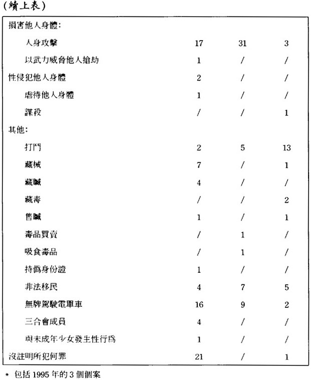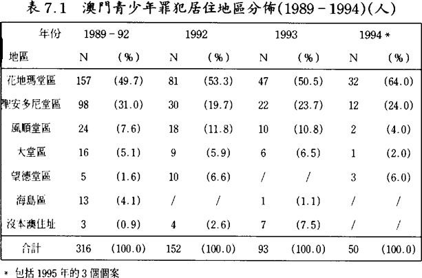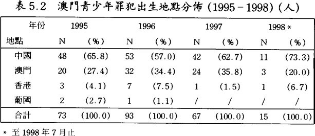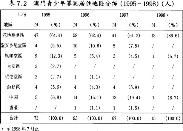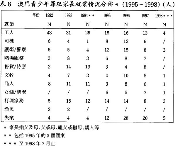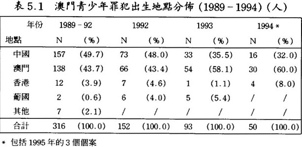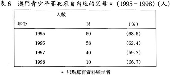在1989至1992年之間的靑少年罪犯在內地出生者佔大約一半;到了1993至1998年的時候,已轉爲在澳門出生者爲主,佔六成半或以上。(見表5.1及5.2)但若追查他們父母或家長的背景,發現有超過六、七成以上的都是來自內地的新移民;(見表6)因此,可以推論大部份靑少年罪犯是第二代的新移民。此外,大部份靑少年罪犯都是居住在澳門的北區(花地瑪堂),(見表7.1及7.2)一個主要由低下階層及新移民人口所構成的地區,故可再引證他們父母或家長的新移民背景。
