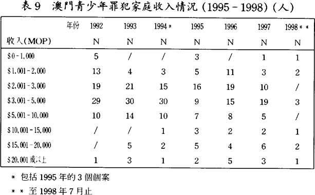 以上已說明大多數澳門靑少年罪犯居住於北區,反映了他們的階層背景,屬於低下階層者居多;加上從他們父母或家長所從事的職業及收入,也可反映他們較低的家庭社會經濟地位。1992至1998年之間靑少年罪犯的父母或家長大多數是工人,其次是當司機、護衛及警察,而母親留在家壳打理家務、照顧家人但值得注意的是自1995年起,靑少年罪犯父母或家長的失業情況增加了不少。(見表8)至於靑少年罪犯家庭收入方面的情況,在1992至1998年之間,都是以MOP$2,001-5,000之間者佔最多,(見表9)屬於低下階層的收入,並不富裕。