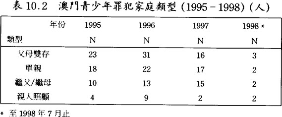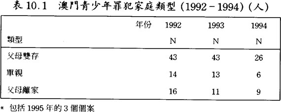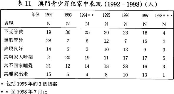 在澳門靑少年罪犯當中,有不少是來自單親、父或母再婚、或父母都不存在的家庭,(見表10.1及10.2)反映了他們的家庭結構並不完整;這發現引證了新移民背景家庭所產生的問題。較多家長指出犯罪靑少年在家中不受管敎,更有不少家長認爲自己無暇管敎他們;稱犯罪靑少年在家中表現良好者亦有,但只佔十分少數的例子。(見表11)靑少年罪犯在家庭中常見的偏差行爲則常與家人吵架、常不回家睡覺、及常離家出走等情況至爲普遍。(見表11)假若靑少年經常在外不歸家,造成了較多與不良份子接觸的機會,也是導致他們犯罪的原因之一。