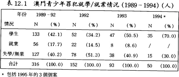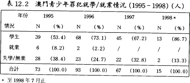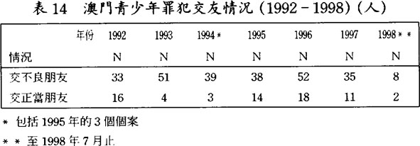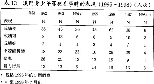 1989至1993年之間,澳門靑少年罪犯多是失學無業者,佔四、五成之多,但到了1994至1998年之間,則減爲兩至四成之間;(見表12.1及12.2)換言之,以學生身份參予犯罪活動的靑少年有上升的趨勢。此外,大部份靑少年罪犯在學時的成績都較差,(見表13)而操行方面也表現不佳,多存在不聽老師話、搗亂、暴力行爲的情況。(見表13)假若在學校時不論學業或操行的表現都不理想,靑少年多對學校正面價值社會組群的依附減少,也是導致他們傾向於依附學校以外的社會組群,往往這些社會組群都不是正面價值的社會組群,增加了他們出現犯罪行爲的可能性。