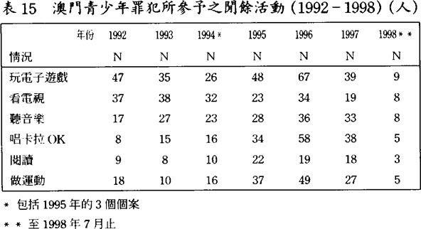 大部份靑少年罪犯都曾交了不良朋友,(見表14)継而引致他們犯罪。靑少年罪犯甚少參予康樂益智的群體活動,他们常到遊戲機中心玩電子遊戲的佔大多數,其餘的閒餘時間則喜歡在家中收看電視及聽音樂爲主,亦有不少喜歡唱卡拉OK,通常到卡拉OK店內唱。(見表15)由於電子遊戲機中心及卡拉OK店的場所較複雜,易於結識不良份子;由於靑少年罪犯常到這些場所,這可能是導致他們犯罪的原因之一。