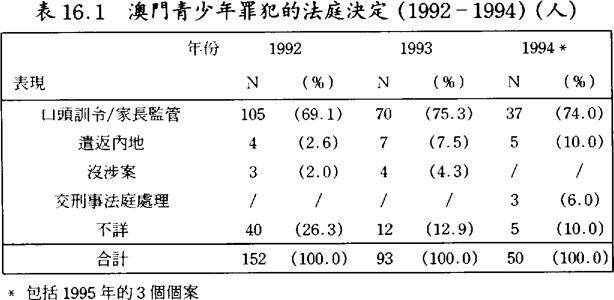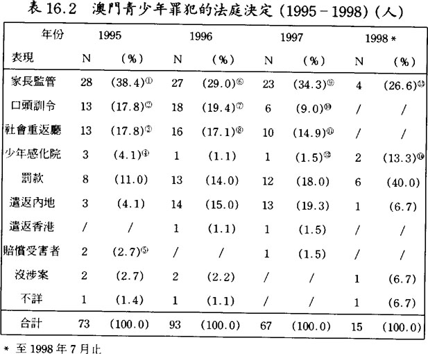 在接受法庭詢問過程中,若犯事証據不足便會獲得法官當庭釋放;但假若証據充足,法官通常可以運用很多種的決定方式,但最常使用者以口頭訓令、非機構性監護處罰(社會重返廳)、及機構性監護處罰(少年感化院)爲主。以1992至1994年爲例,有大約七成之法官決定爲口頭訓令、交還家長監管;1995至1998年則平均大約五成以下的法官決定是口頭訓令、交還家長監管,使用由社會重返廳技術人員跟進的非機構性監護處罰有增加的趨勢。(見表16.1及16.2)同時,自1995年起,任何未成年犯事人的資料都在檢察院有記錄,作爲法官決定之參照,但這些記錄並不等同於成年人的刑事記錄;一旦未成年犯事人的資料在檢察院制作記錄,即開始加入司法事務司預防靑少年犯罪計劃程序當中。