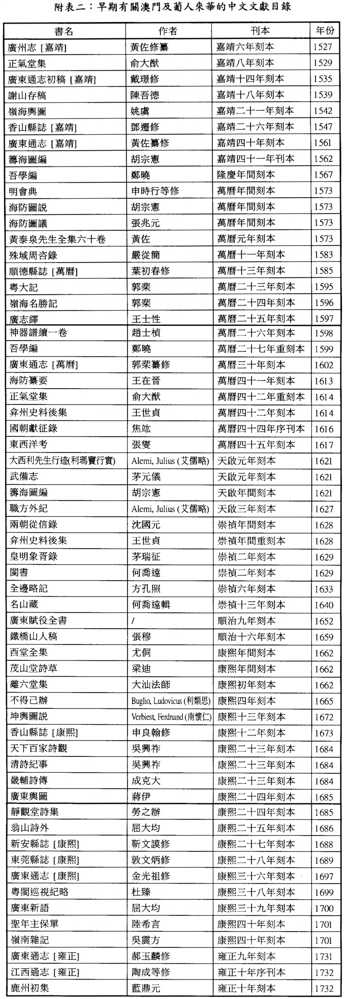由於葡人早於正德九年,即1514年已開始在中國境內活動,包括浙江、屯門、上下川島等地,目前發現最早有關葡人來華的記述的作品可推算為1521年黃佐修的《廣州志》、其餘依次有俞大猷的《正氣堂集》、戴璟的《廣東通志初稿》,陳吾德的《謝山存稿》等。至於姚虞的《嶺海輿圖》是現有最早在廣東海圖中出現濠鏡一詞的古籍,之後鄧遷的《[嘉靖]香山縣誌》、黃佐的《[嘉靖]廣東通志》,及其他方志史書均有提及澳門的地理位置,葡人獲取在澳門定居的過程,海上貿易制度等內容。(參見附表二)