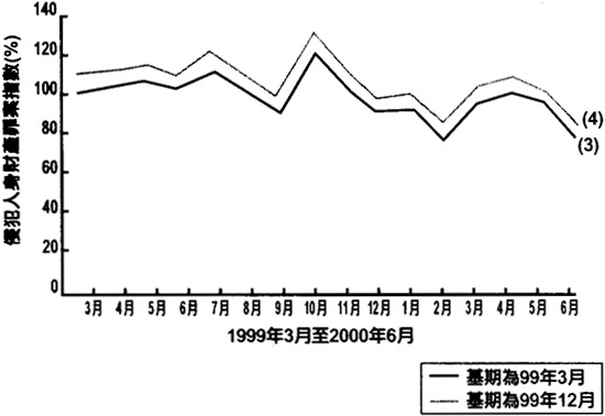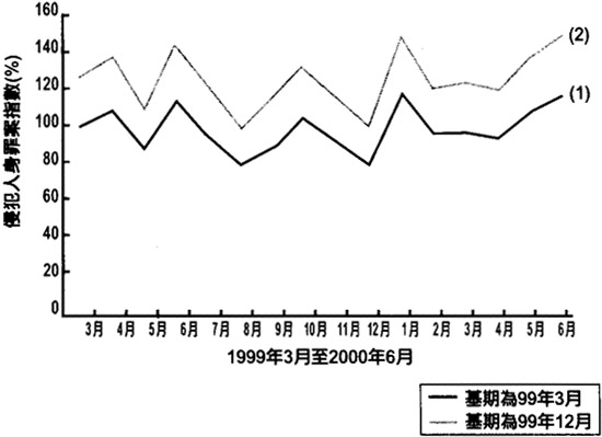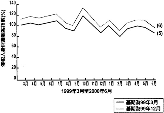 表2 表3 表4 ┌─────────────┐┌─────────────┐┌─────────────┐ │ 侵犯人身罪案指數 ││侵犯財産罪案指數 ││侵犯人身財産罪案指數 │ ├───┬─────────┤├───┬─────────┤├───┬─────────┤ │報告期│ 基期 ││報告期│ 基期 ││報告期│ 基期 │ │ ├────┬────┤│ ├────┬────┤│ ├────┬────┤ │ │99年 │99年 ││ │99年 │99年 ││ │99年 │99年 │ │ │ 3月 │12月 ││ │ 3月 │12月 ││ │ 3月 │12月 │ ├───┼────┴────┤├───┼────┴────┤├───┼────┴────┤ │1999年│ ││1999年│ ││1999年│ │ ├───┼────┬────┤├───┼────┬────┤├───┼────┬────┤ │ 3月 │ 100.0│ 126.9││3月 │ 100.0│ 110.2││ 3月 │ 100.0│ 113.7│ ├───┼────┼────┤├───┼────┼────┤├───┼────┼────┤ │ 4月 │ 108.0│ 137.0││4月 │ 101.8│ 112.1││ 4月 │ 103.2│ 117.3│ ├───┼────┼────┤├───┼────┼────┤├───┼────┼────┤ │ 5月 │ 86.9│ 110.2││5月 │ 105.3│ 116.0││ 5月 │ 101.0│ 114.8│ ├───┼────┼────┤├───┼────┼────┤├───┼────┼────┤ │ 6月 │ 113.9│ 144.0││6月 │ 100.7│ 110.9││ 6月 │ 103.7│ 117.9│ ├───┼────┼────┤├───┼────┼────┤├───┼────┼────┤ │ 7月 │ 95.6│ 121.3││7月 │ 109.5│ 120.6││ 7月 │ 106.3│ 120.8│ ├───┼────┼────┤├───┼────┼────┤├───┼────┼────┤ │ 8月 │ 78.1│ 99.1││8月 │ 100.4│ 110.7││ 8月 │ 95.3│ 108.3│ ├───┼────┼────┤├───┼────┼────┤├───┼────┼────┤ │ 9月 │ 89.1│ 113.0││9月 │ 89.8│ 99.0││ 9月 │ 89.7│ 101.9│ ├───┼────┼────┤├───┼────┼────┤├───┼────┼────┤ │ 10月│ 104.4│ 132.0││10月 │ 117.O│ 128.9││ 10月│ 114.0│ 129.6│ ├───┼────┼────┤├───┼────┼────┤├───┼────┼────┤ │ 11月│ 93.4│ 118.5││11月 │ 101.8│ 112.1││ 11月│ 99.8│ 113.5│ ├───┼────┼────┤├───┼────┼────┤├───┼────┼────┤ │ 12月│ 78.8│ 100.0││12月 │ 90.7│ 100.0││ 12月│ 88.0│ 100.0│ ├───┼────┴────┤├───┼────┴────┤├───┼────┴────┤ │2000年│ ││2000年│ ││2000年│ │ ├───┼────┬────┤├───┼────┬────┤├───┼────┬────┤ │ 1月 │ 116.8│ 148.1││1月 │ 92.5│ 101.9││ 1月 │ 98.3│ 111.5│ ├───┼────┼────┤├───┼────┼────┤├───┼────┼────┤ │ 2月 │ 94.9│ 120.4││2月 │ 78.4│ 86.4││ 2月 │ 82.2│ 93.5│ ├───┼────┼────┤├───┼────┼────┤├───┼────┼────┤ │ 3月 │ 97.1│ 123.1││3月 │ 93.6│ 103.2││ 3月 │ 94.4│ 107.3│ ├───┼────┼────┤├───┼────┼────┤├───┼────┼────┤ │ 4月 │ 94.2│ 119.4││4月 │ 99.1│ 109.2││ 4月 │ 98.0│ 111.3│ ├───┼────┼────┤├───┼────┼────┤├───┼────┼────┤ │ 5月 │ 107.3│ 136.1││5月 │ 93.2│ 102.7││ 5月 │ 96.4│ 109.6│ ├───┼────┼────┤├───┼────┼────┤├───┼────┼────┤ │ 6月 │ 117.5│ 149.1││6月 │ 78.9│ 86.9││ 6月 │ 87.8│ 99.8│ └───┴────┴────┘└───┴────┴────┘└───┴────┴────┘ |