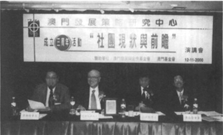 為探討澳門社團在澳門回歸後的重新定位及未來發展路向等問題,澳門發展策略研究中心於二零零零年十一月十二日(周日)下午三時假新世界帝濠酒店四樓宴會廳舉辦了主題為“社團現狀與前瞻”演講會。演講會邀請到香港廣東社團總會秘書長歐陽成潮先生、香港城市大學人文及社會科學院副院長郭鍵勳博士專程來澳出席並擔任演講嘉賓,本中心會員、本澳各大社團代表、社會各界人士、傳媒及市民等近二百人出席了演講會,本中心梁維特會長主持了是次演講會。