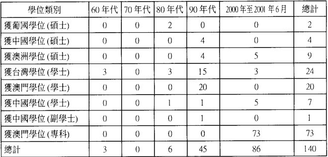 ┌──────────┬──────┐ │ 辦學單位名稱 │ 辦學次數 │ ├──────────┼──────┤ │行政暨公職司 │ 25 │ ├──────────┼──────┤ │澳門圖協 │ 24 │ ├──────────┼──────┤ │澳門理工學院 │ 23 │ ├──────────┼──────┤ │澳門大學 │ 9 │ ├──────────┼──────┤ │澳門成人教育中心 │ 4 │ ├──────────┼──────┤ │教青司 │ 3 │ ├──────────┼──────┤ │澳門中華教育會 │ 3 │ ├──────────┼──────┤ │城市科技公司 │ 2 │ ├──────────┼──────┤ │文化局 │ 1 │ ├──────────┼──────┤ │華廈文化中心 │ 1 │ ├──────────┼──────┤ │澳門中華學生聨合總會│ 1 │ ├──────────┼──────┤ │總計 │ 96 │ └──────────┴──────┘ |