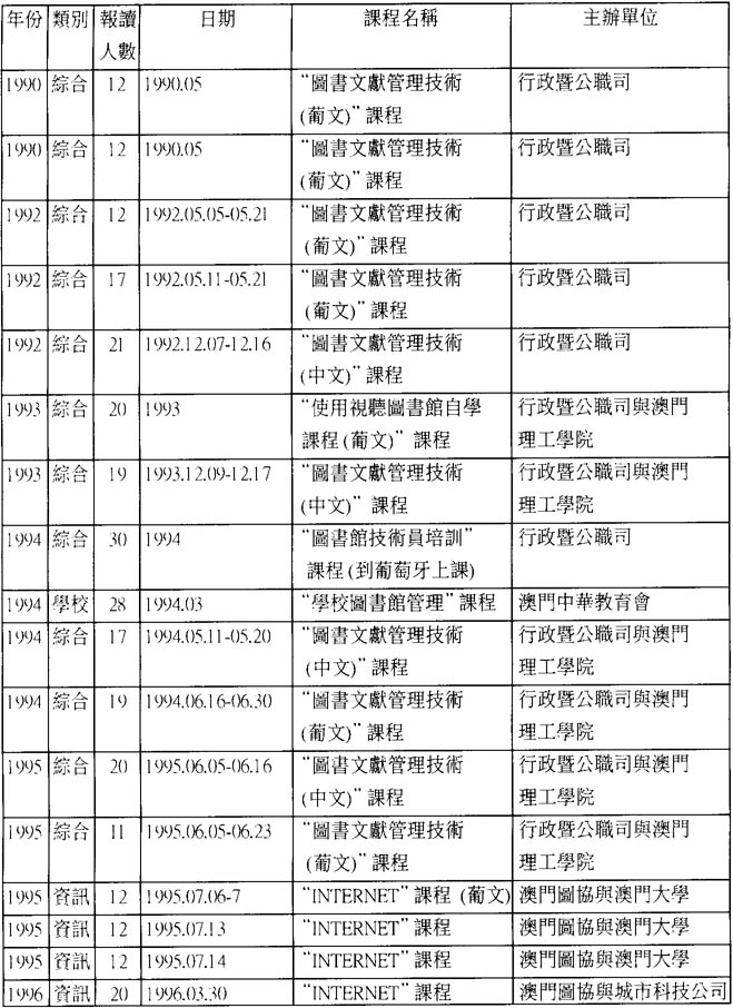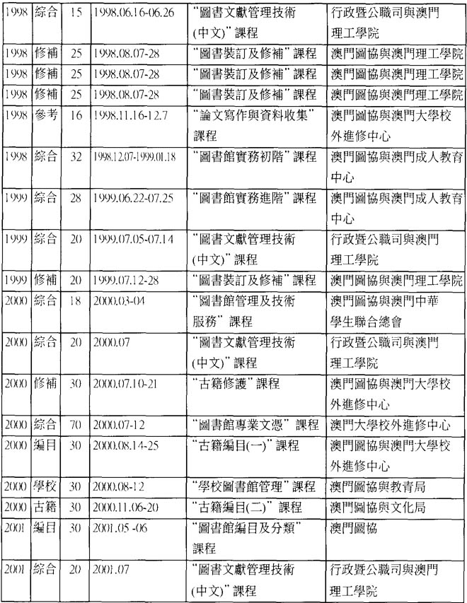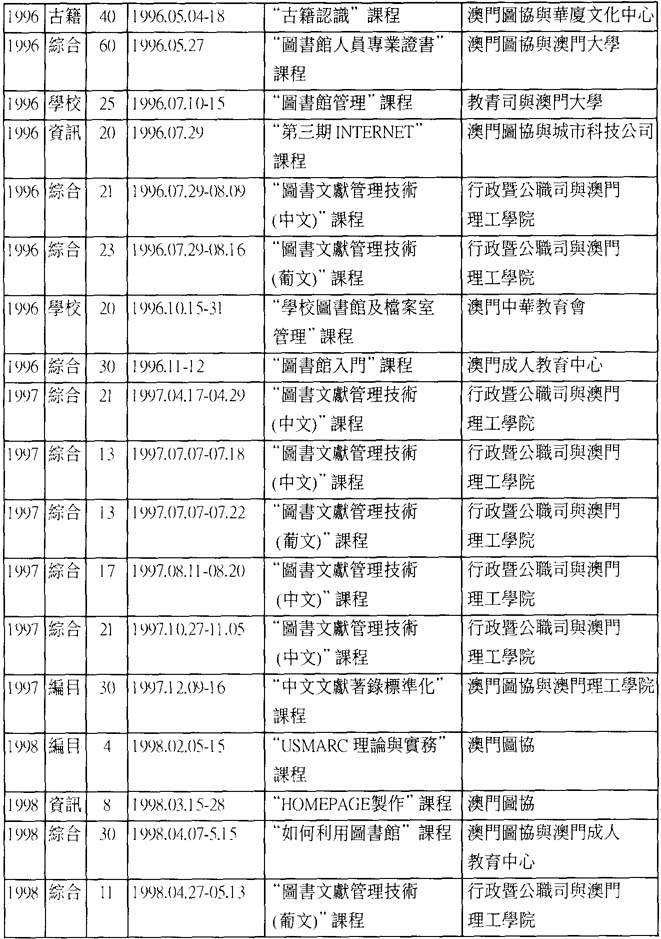 ┌──┬──┬──┬──┬──┬──┬──┬────┬─────┬──────┐ │年份│綜合│編目│古籍│修補│學校│參考│ 資訊 │ 總計人次 │總計辦學次數│ │ │ │ │ │ │ │ │ │ │ │ ├──┼──┼──┼──┼──┼──┼──┼────┼─────┼──────┤ │1990│ 24 │ │ │ │ │ │ │ 24 │ 2 │ ├──┼──┼──┼──┼──┼──┼──┼────┼─────┼──────┤ │1991│ │ │ │ │ │ │ │ 0 │ 0 │ ├──┼──┼──┼──┼──┼──┼──┼────┼─────┼──────┤ │1992│ 50 │ │ │ │ │ │ │ 50 │ 3 │ ├──┼──┼──┼──┼──┼──┼──┼────┼─────┼──────┤ │1993│ 39 │ │ │ │ │ │ │ 39 │ 2 │ ├──┼──┼──┼──┼──┼──┼──┼────┼─────┼──────┤ │1994│ 66 │ │ │ │ 28 │ │ │ 94 │ 4 │ ├──┼──┼──┼──┼──┼──┼──┼────┼─────┼──────┤ │1995│ 31 │ │ │ │ │ │ 36 │ 67 │ 5 │ ├──┼──┼──┼──┼──┼──┼──┼────┼─────┼──────┤ │1996│134 │ │ 40 │ │ 45 │ │ 40 │ 259 │ 9 │ ├──┼──┼──┼──┼──┼──┼──┼────┼─────┼──────┤ │1997│ 85 │ 30 │ │ │ │ │ │ 115 │ 6 │ ├──┼──┼──┼──┼──┼──┼──┼────┼─────┼──────┤ │1998│ 88 │ 4 │ │ 75 │ │ 16 │ 8 │ 191 │ 11 │ ├──┼──┼──┼──┼──┼──┼──┼────┼─────┼──────┤ │1999│ 48 │ │ │ 20 │ │ │ │ 68 │ 3 │ ├──┼──┼──┼──┼──┼──┼──┼────┼─────┼──────┤ │2000│108 │ 30 │ 30 │ 30 │ 30 │ │ │ 228 │ 7 │ ├──┼──┼──┼──┼──┼──┼──┼────┼─────┼──────┤ │2001│ 20 │ 30 │ │ │ │ │ │ 50 │ 2 │ ├──┼──┼──┼──┼──┼──┼──┼────┼─────┼──────┤ │總計│693 │ 94 │ 70 │125 │103 │ 16 │ 84 │ 1,185 │ 54 │ └──┴──┴──┴──┴──┴──┴──┴────┴─────┴──────┘ |